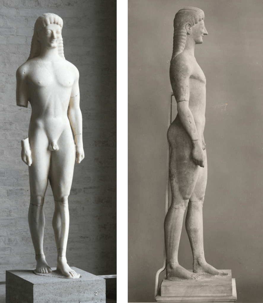 Die Figuren dieser Zeit sind stark von der ägyptischen Plastik beeinflusst, was sich in der Frontalität, der starren Haltung und den geballten Fäusten zeigt. Die Statuen waren normalerweise vollplastisch gestaltet, das heißt, sie waren nirgends befestigt (z. B. nicht mehr an einer Rückenplatte), also freistehend und von allen Seiten bearbeitet.