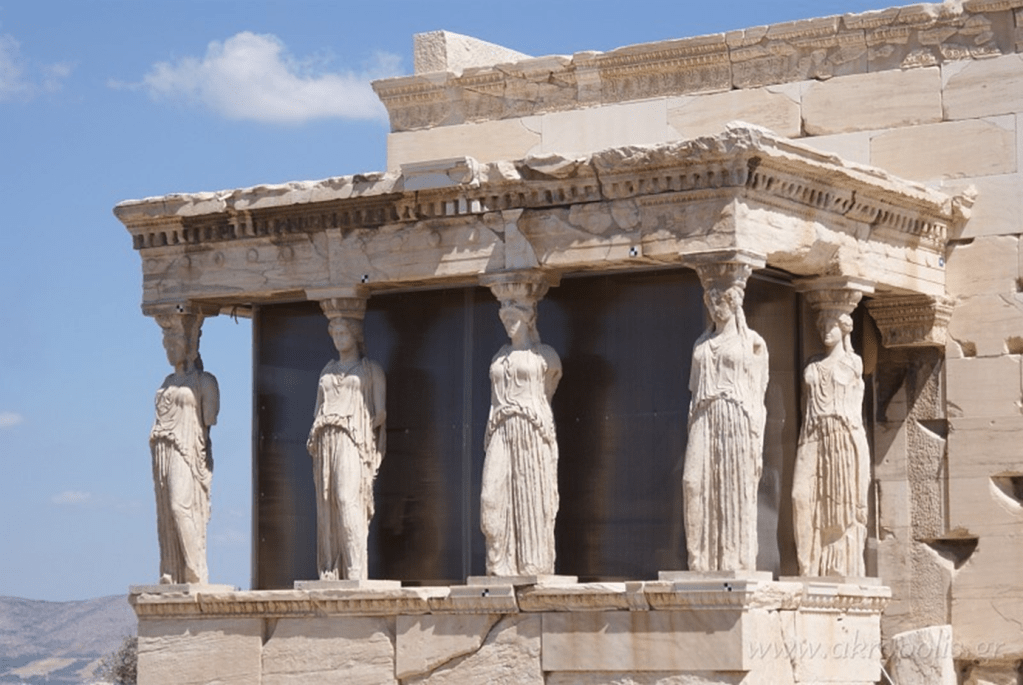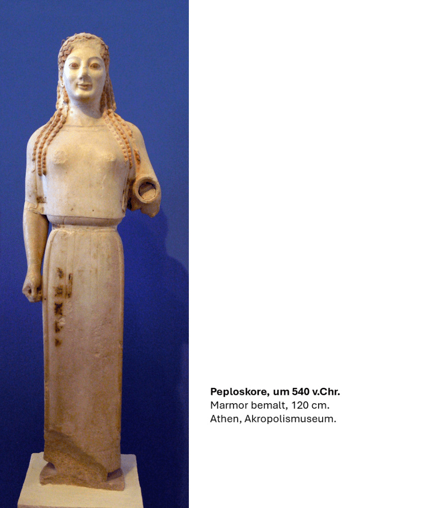 Neben den männlichen Figuren wurden auch bekleidete Mädchen, die sogenannten Koren, dargestellt. Diese Figuren haben oft einen säulenartigen Aufbau und tragen stoffreiche, drapierte Gewänder sowie sorgfältig frisierte Haare mit Kopfschmuck.