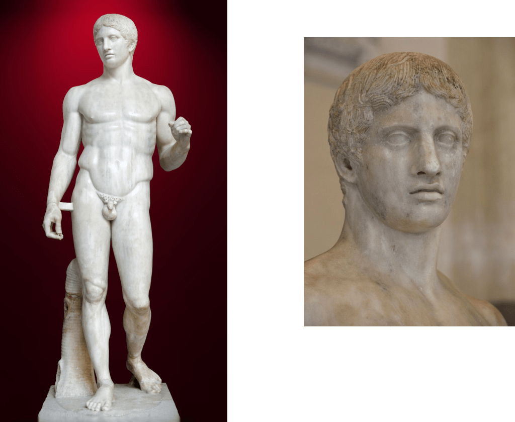 Das Ideal des Menschen vereint Körper und Geist: Ein ideal geformtes Antlitz steht für Bildung und Harmonie. Die Griechen strebten nach einem Gleichgewicht der Kräfte, was sich in der Darstellung von Ruhe und Bewegung zeigt. Der Kontrapost, eine Technik, die den Wechsel von Standbein- und Spielbein-Haltung zeigt, wird in dieser Zeit perfektioniert.