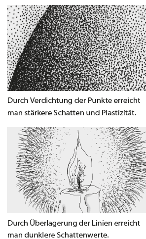 Durch die Verdichtung von Punkten, Linien, Strukturen und Strukturen kann der Kontrast zwischen Hell und Dunkel herausgearbeitet werden. Je größer der Hell-Dunkel-Kontrast, desto größer ist die Spannung im Bild und es entsteht „Dramatik“. Man spricht auch vom „Geheimnis des Hell Dunkel“, weil die Wirkungen dieses grafischen Gestaltungsmittels so vielfältig sein können.