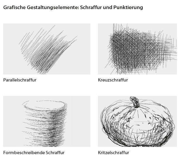 In der zeichnerischen Gestaltung bilden Punkt, Linie und Fläche die grundlegenden Elemente. Materialien und Oberflächen können durch den gezielten Einsatz von Linien nachgeahmt werden – die sogenannte Struktur. Gefüge von Linien bilden eine Schraffur, die im differenzierten Einsatz einen Hell-Dunkel-Kontrast erzeugen können. Diese Mittel sind das „Vokabular“ der Grafik und ermöglichen es Künstlerinnen und Künstlern, komplexe Inhalte, Atmosphären und Strukturen visuell umzusetzen.
